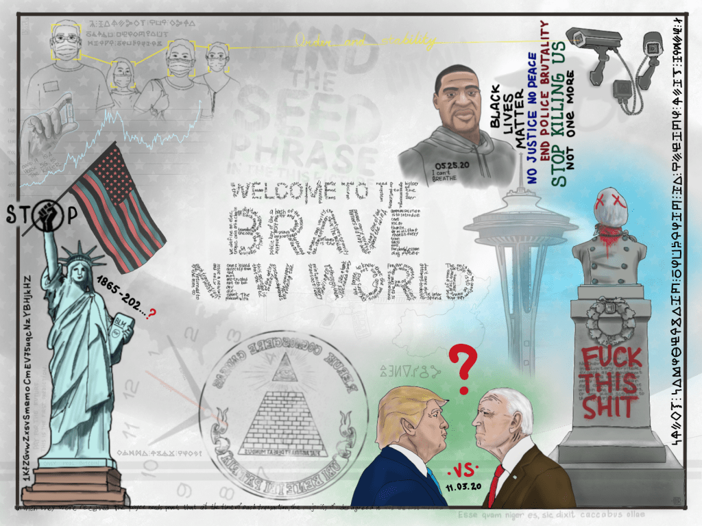 - The Latin to the bottom left refers to “The Pot Calling The Kettle Black” with ‘Black’ also being repeated in references to the Black Lives Matter movement, so it’s likely another word
